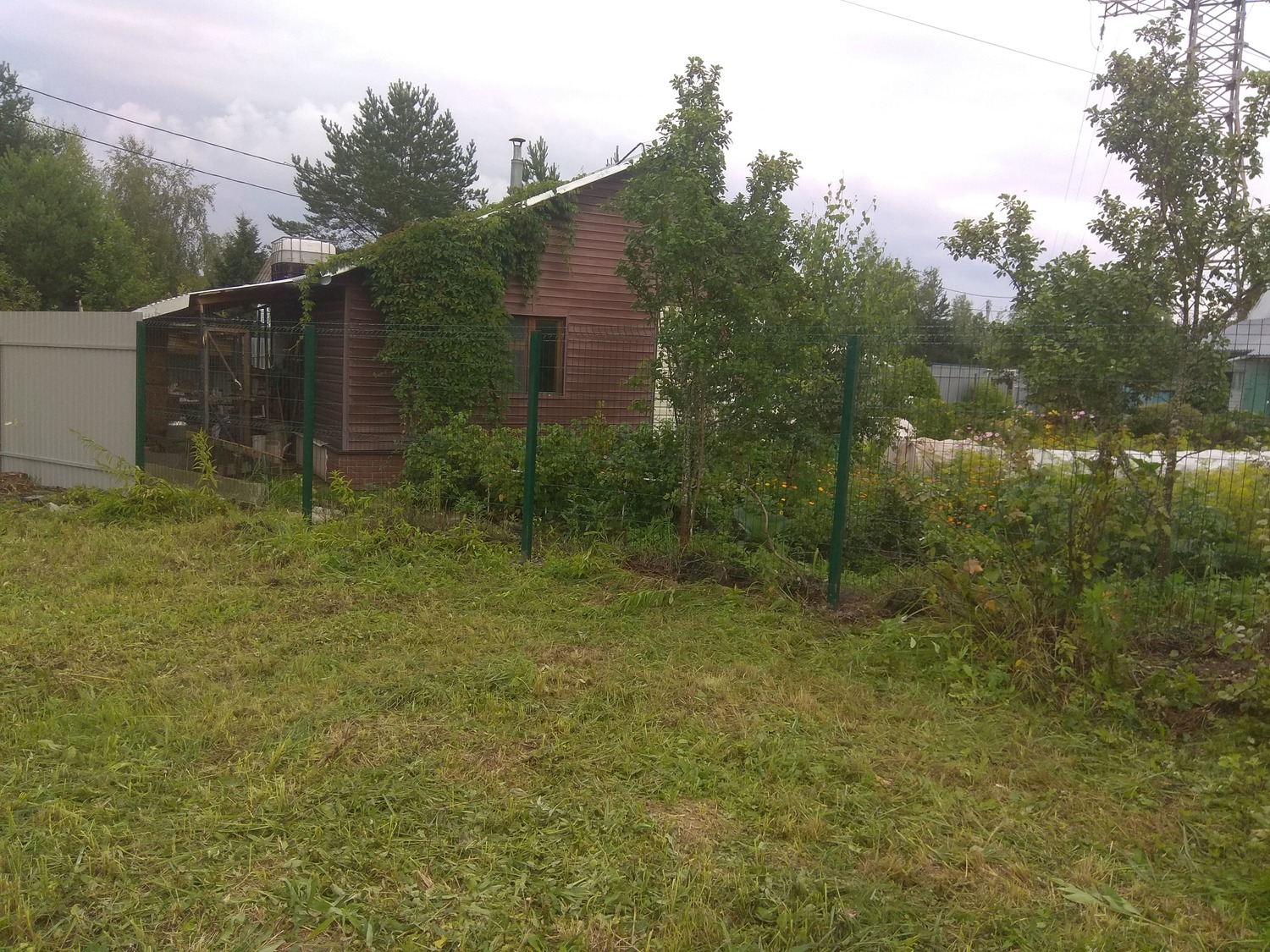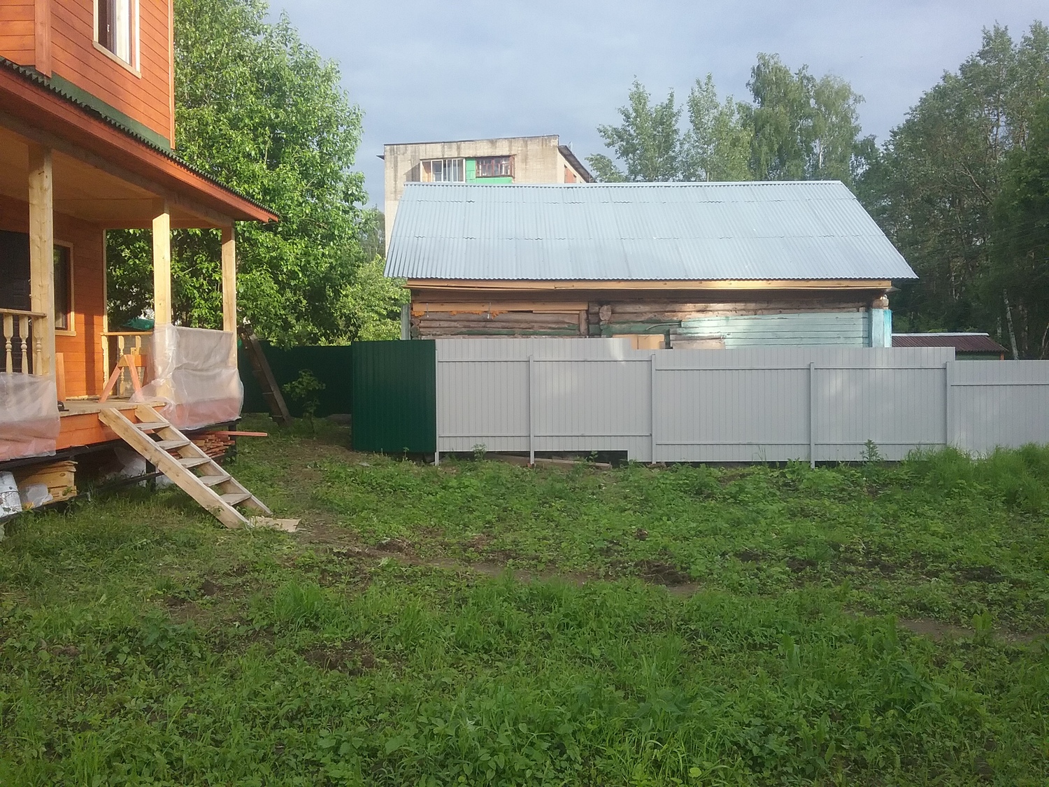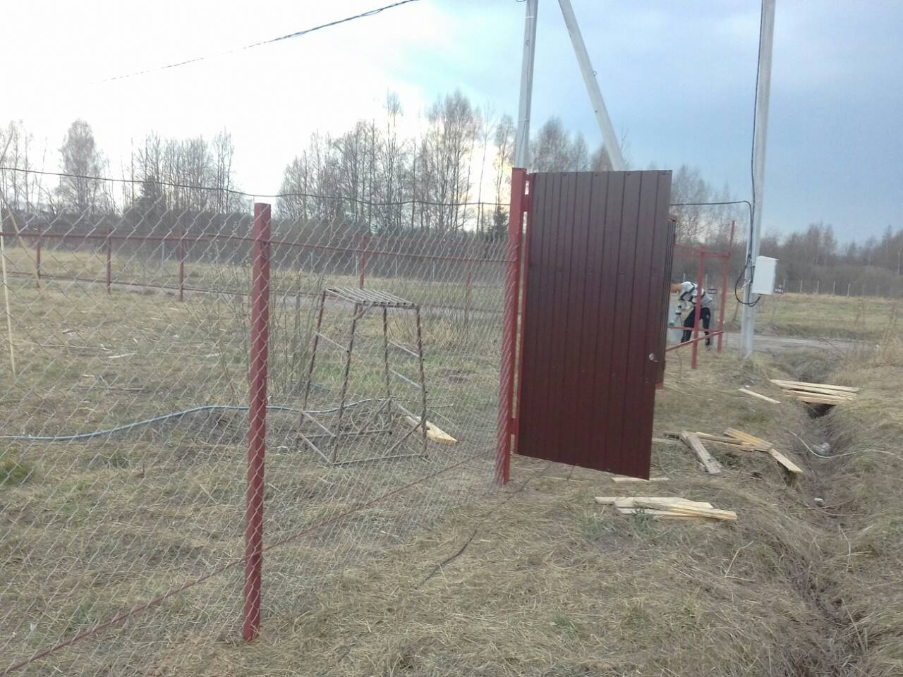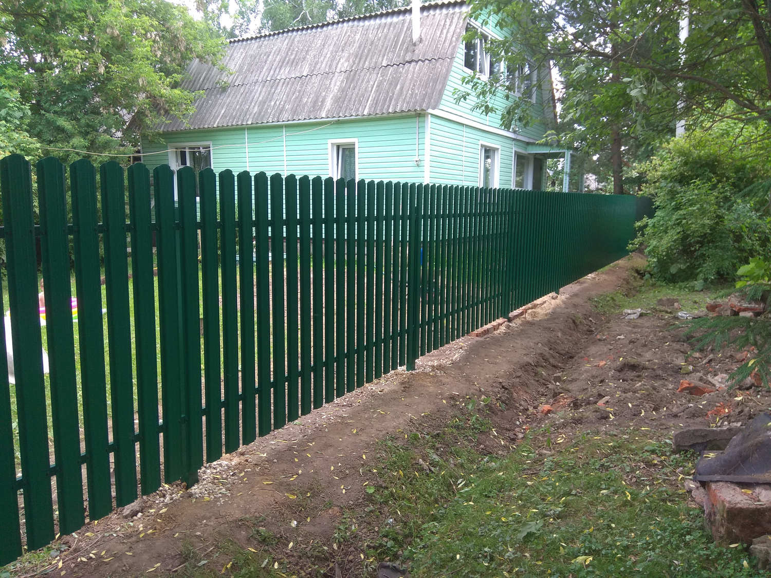 - Материал: Профнастил, металлический штакетник, сетка, проф труба, дерево